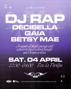 A night of high energy old school to new school jungle and drum n bass welcoming the legendary DJ Rap for her Fox debut – one of the undisputed queens of the DnB scene. She will be joined by some of the hottest emerging talent Decibella fresh from her debut record on AKO Beatz, plus Kool FM resident Gaia plus Sexy Lady Massive’s Betsy Mae