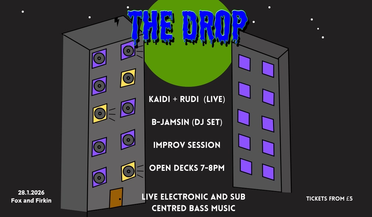 The Drop is a night dedicated to electronic bass music, joining the dots between live musicians, DJs and producers. Hosted by Rudi Creswick—a bassist and producer known for his work with a multitude of UK soul and jazz artists and for his room shaking live bass—The Drop draws inspiration from Rudi’s roots in the vibrant DJ and club scene of Newcastle. There, he immersed himself in the sounds of Dubstep, Jungle, Dub and Garage – genres born from black musical innovation through soundsystem culture. Now, Rudi brings this energy to ‘The Drop’ through guest performances and DJs, live improv sessions and open decks, for bass music lovers and creators alike.
